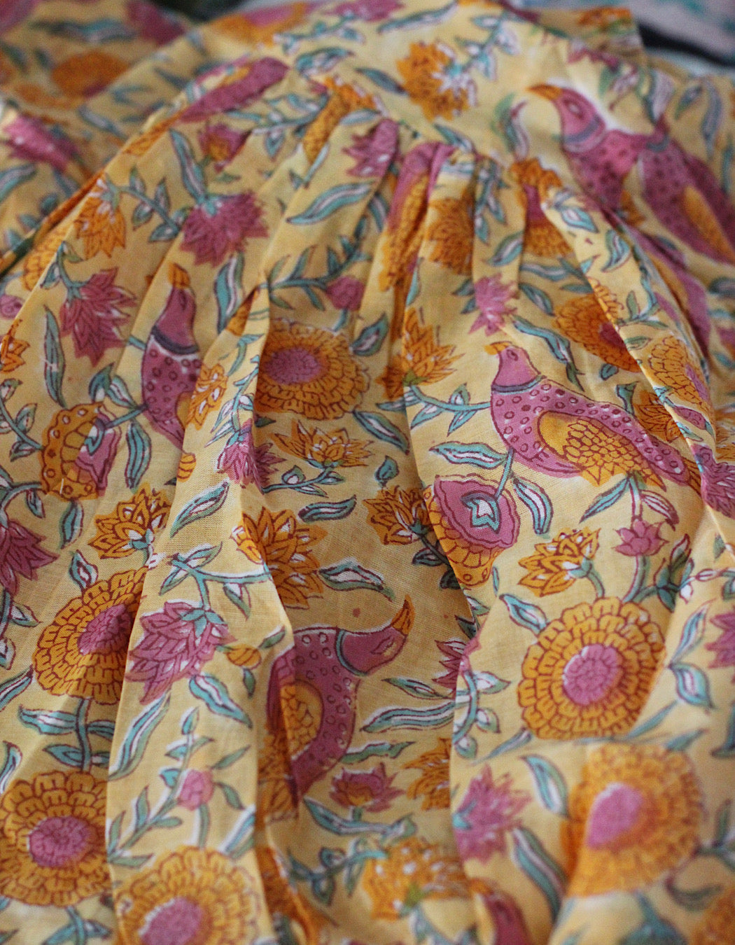Golden Soma is a new addition to our popular Hawa dresses. This warm and sunny print showcases a gorgeous scene of a fragrant summer garden with birds and flowers. This print is designed in Australia by owner and designer Shweta Bonneau and hand-block printed in India.