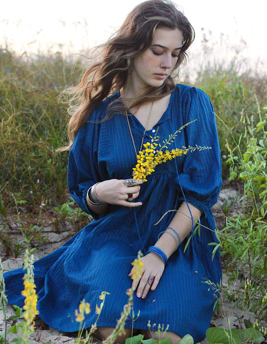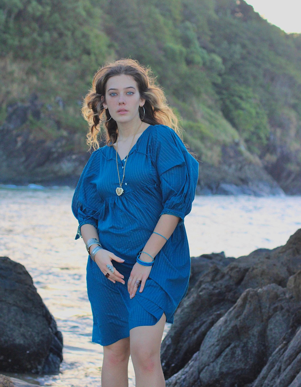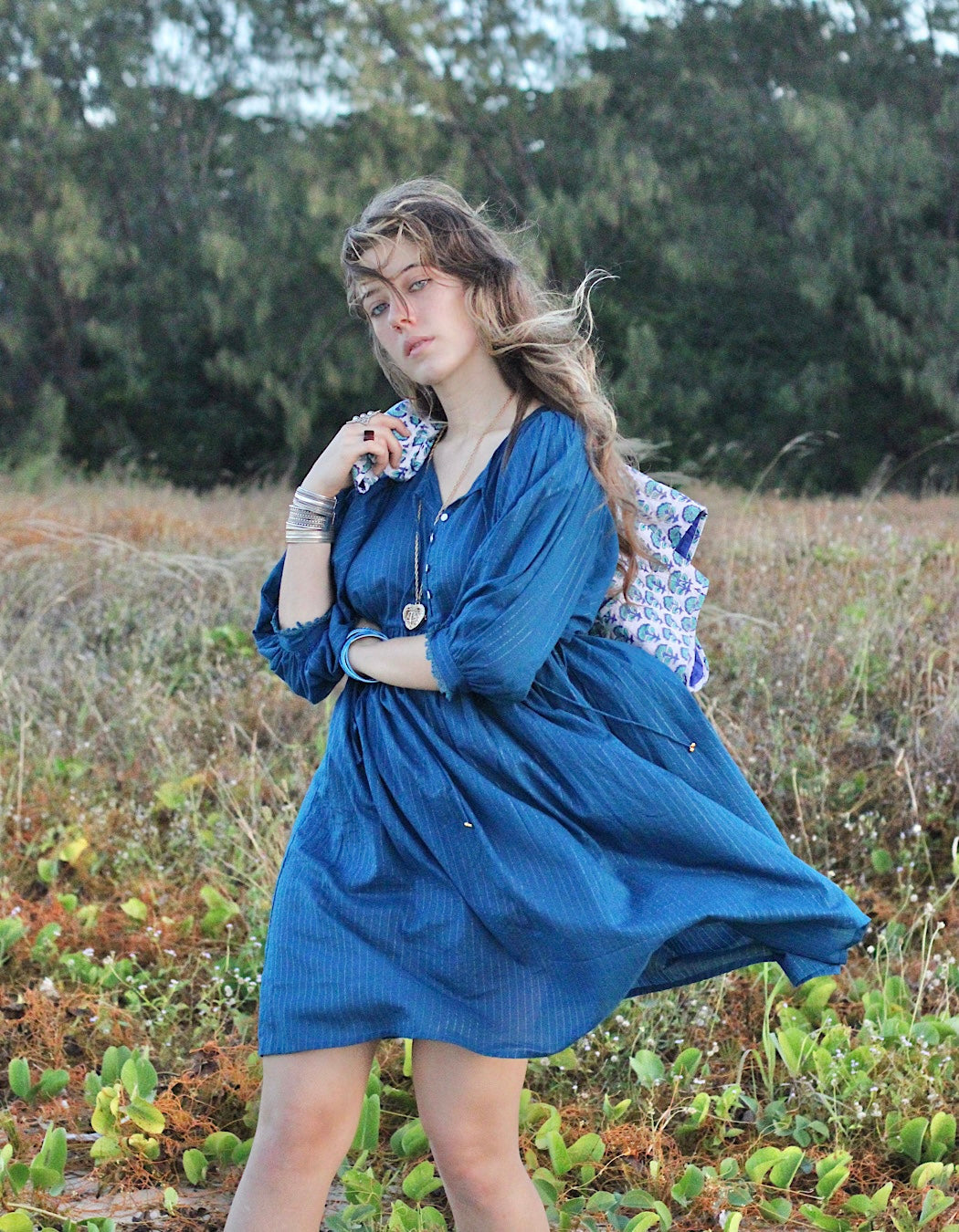 It has trim on the sleeves, as well as strings with bells, and front buttons to adjust the neckline. This dress is made ethically in very small quantities.